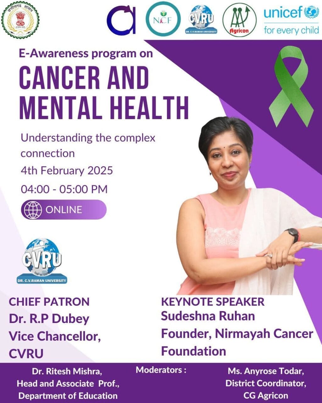 इस जागरूकता सत्र में कैंसर के प्रभाव, मानसिक स्वास्थ्य पर पड़ने वाले दुष्प्रभाव और मरीजों को मानसिक रूप से सशक्त बनाने के उपायों पर चर्चा की गई। कार्यक्रम में भाग लेने वाले प्रतिभागियों ने विशेषज्ञों से महत्वपूर्ण जानकारी प्राप्त की और अपने प्रश्नों के उत्तर पाए।आयोजन निम्नलिखित संगठनों के सहयोग से किया गया जिसमे डॉ. सी.वी. रमन विश्वविद्यालय (CVRU) बिलासपुर , निर्माणय कैंसर फाउंडेशन रायपुर ,छत्तीसगढ़ एग्रीकोंन, यूनिसेफ शामिल थे।