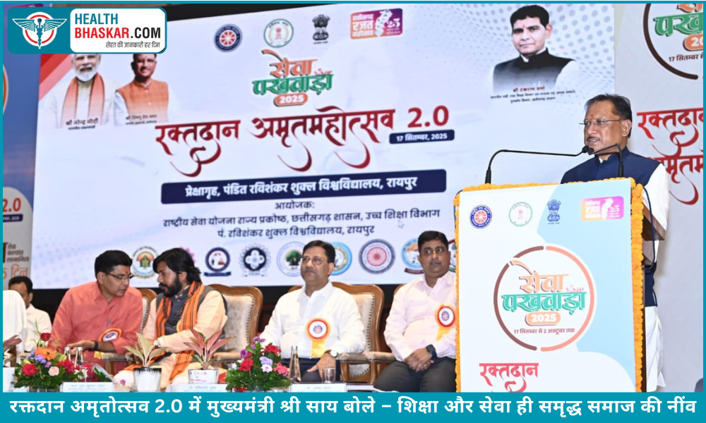 Healthbhaskar.comरायपुर, 18 सितम्बर 2025 राजधानी रायपुर स्थित पं. रविशंकर शुक्ल विश्वविद्यालय के प्रेक्षागृह में आज आयोजित रक्तदान अमृतोत्सव 2.0 कार्यक्रम में मुख्यमंत्री विष्णुदेव साय शामिल हुए। इस अवसर पर उन्होंने कहा कि शिक्षा केवल डिग्री प्राप्त करने या नौकरी पाने का माध्यम नहीं है, बल्कि यह जीवन के हर क्षेत्र में सफलता और समाज के विकास की सबसे मजबूत आधारशिला है।