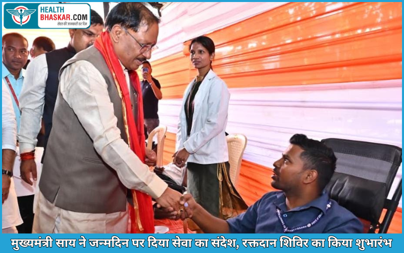 Healthbhaskar.com: रायपुर, 21 फरवरी 2026। मुख्यमंत्री विष्णुदेव साय ने अपने 62वें जन्मदिन के अवसर पर समाज सेवा और मानवता का अनूठा उदाहरण प्रस्तुत करते हुए राजधानी रायपुर स्थित मुख्यमंत्री निवास परिसर में आयोजित विशाल रक्तदान शिविर का शुभारंभ किया। इस अवसर पर उन्होंने भगवान धन्वंतरि की विधिवत पूजा-अर्चना कर प्रदेशवासियों के स्वास्थ्य और सुख-समृद्धि की कामना की तथा रक्तदाताओं को सम्मानित कर उनका उत्साहवर्धन किया। इस विशेष अवसर पर अल्फा ग्लोब फाउंडेशन, रायपुर एवं शिवनाथ ब्लड सेंटर के संयुक्त तत्वावधान में 62 लोगों के रक्तदान की विशेष व्यवस्था की गई थी। शिविर में बड़ी संख्या में युवाओं, सामाजिक संगठनों के सदस्यों, जनप्रतिनिधियों और आम नागरिकों ने भाग लेकर रक्तदान किया।