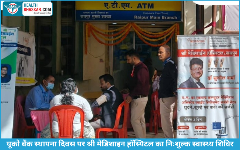 Healthbhaskar.com: रायपुर, 9 जनवरी 2026। सार्वजनिक स्वास्थ्य के प्रति सामाजिक उत्तरदायित्व को निभाते हुए श्री मेडिशाइन हॉस्पिटल द्वारा यूको बैंक के 84वें स्थापना दिवस के अवसर पर एक निःशुल्क स्वास्थ्य शिविर का सफल आयोजन किया गया। यह शिविर यूको बैंक, बीएसएनएल कैंपस, फाफाडीह चौक, रायपुर में आयोजित हुआ, जिसमें बैंक कर्मचारियों सहित आसपास के क्षेत्र के नागरिकों ने बड़ी संख्या में सहभागिता की। शिविर का मुख्य उद्देश्य आमजन को स्वास्थ्य के प्रति जागरूक करना, समय पर जांच के महत्व को रेखांकित करना और प्रारंभिक अवस्था में रोगों की पहचान सुनिश्चित करना रहा।