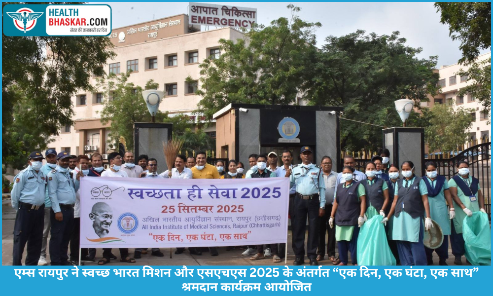 Healthbhaskar.com: रायपुर,26 सितंबर 2025 भारत सरकार के स्वच्छ भारत अभियान और राष्ट्रव्यापी स्वच्छता ही सेवा (एसएचएस) 2025 के अंतर्गत आज एम्स रायपुर ने एक अनोखा श्रमदान कार्यक्रम आयोजित कर स्वच्छता के प्रति सामूहिक संकल्प का संदेश दिया। “एक दिन, एक घंटा, एक साथ” की थीम पर आयोजित इस पहल ने दिखाया कि जब समाज के सभी वर्ग एक साथ आते हैं, तो स्वच्छता को आदत और संस्कार बनाया जा सकता है।